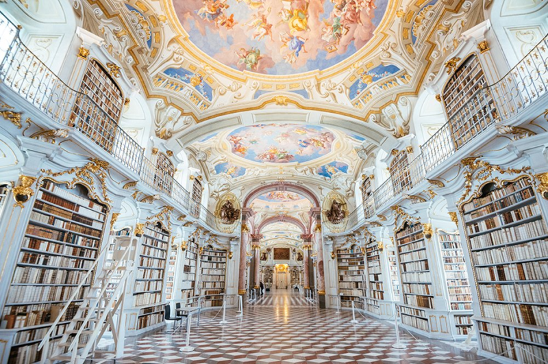 Admont Abbey Kütüphanesi, 1776 yılında Avusturya'da inşa edilmiş. Kütüphane, hem dünyanın en eski manastır kütüphanesi hem de dünyadaki en geniş kitap koleksiyonuna sahip manastır kütüphanesi olarak biliniyor. Bu koleksiyon, bünyesinde 70 bin cilt antik kitap ve bin 400'den fazla el yazması eser bulunduruyor. Zengin dermesinin yanı sıra insanın bilgiye ulaşmasının evrelerini gösteren tavan freskoları da etkileyici nitelikte. Kütüphane aynı zamanda ilginç kapı tasarımlarına da sahip. Kapı olarak, hemen fark edilmeyen "gerçekçi" sahte kitap dikenleri (sahte kitaplar) kullanılmış.