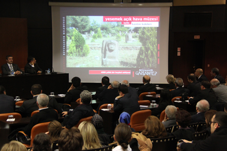 Antep’in doğal ve kültürel varlıklarını bütün olarak değerlendirilmesi gerektiğine değinen Asım Güzelbey, kentin arkeolojik varlıklarıyla konuşmasına başladı. Karkamış antik kenti, Yesemek açık hava müzesi, Rumkale, Dülük antik kenti ve Zeugma antik kentinin Antep’in kökleri olduğunu vurguladı. 20. yy’dan günümüze Antep’in geçirdiği değişimi anlatarak 2004 yılında ÇEKÜL işbirliği ile başlatılan Kültür Yolu Projesi kapsamında yapılan planlama, KUDEB ve proje bürolarının kurulması, eğitim seminerleri, halkla ve esnafla yapılan toplantılarla uygulama çalışmalarını özetledi.