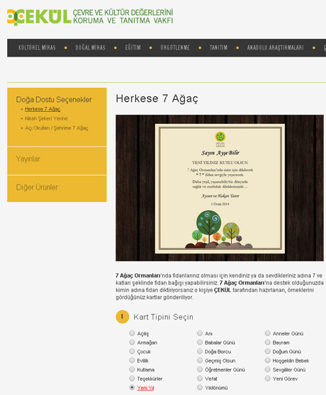 Kurumsal katılım için ise ÇEKÜL Vakfına telefon ya da e-postayla ulaşarak çalışanlarınız ve iş ortaklarınız için yeni yıl kutlama paketi, 700 fidanlık 7 Ağaç Korusu ya da 7 bin fidanlık 7 Ağaç Ormanları seçeneklerini tercih edilebilirsiniz.