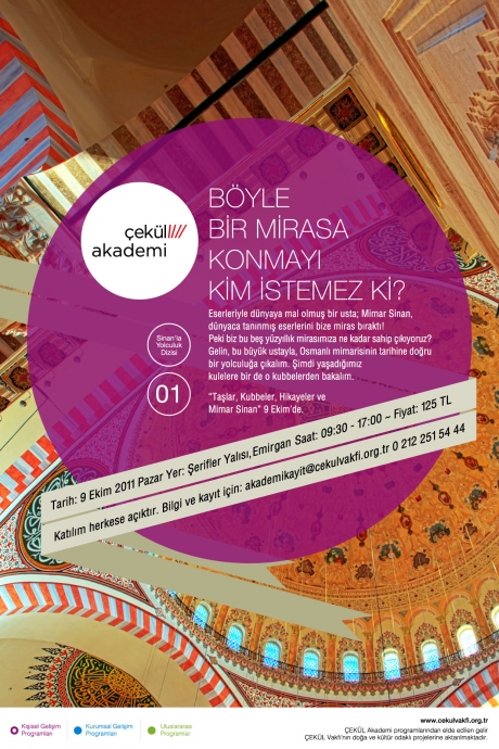 2009 yılında ÇEKÜL Vakfı tarafından kurulan ÇEKÜL Akademi, Kişisel Gelişim, Kurumsal Gelişim ve Uluslararası Programlar olmak üzere üç ana başlık altında eğitim programları düzenliyor. Ekim ayının ilk programı ise “Taşlar, Kubbeler, Hikâyeler ve Mimar Sinan”.