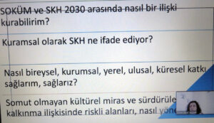 Ankara Hacı Bayram Üniversitesi Türk Halk Bilimi Bölümü Öğretim Üyesi Doç. Dr. Evrim Ölçer Özünel de bu sunumu takiben, SOKÜM’ün mekânsal korunabilirliği üzerine bilgiler verdi. ICOM’un 2007’de SOKÜM’ü tanımına dahil etmesi, alanda yeni bir başlık açmış, somut olmayan kültürel mirasın müzelerde nasıl yer alabileceği konusu gündeme gelmişti. Birleşmiş Milletlerin 2030 sürdürülebilir kalkınma hedeflerini önceleyen müzecilik anlayışını hatırlatan Özünel, bu bağlamda bir sunum yaparak SOKÜM listesinde her ülkenin tek başına ya da ortak dosyalar biçiminde unsurlarını listeye aldırabileceğini hatırlattı.