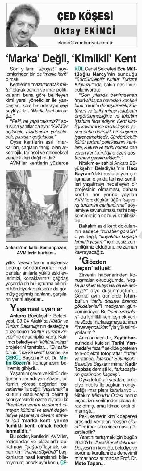 Ankara Büyükşehir Belediyesi, 23-24 Aralık’ta Kültür ve Turizm Bakanlığı’nın desteğiyle düzenlenen “Kültür Turizmi Zirvesi”ne ev sahipliği yaptı. Katılımcı belediyeler “kültürel miras” projelerini tanıttılar... “Ev sahibi”nin “marka kent” takıntısı ise ÇEKÜL Başkanı Prof. Dr. Metin Sözen’in konuşmasını belirlemiş gibiydi...