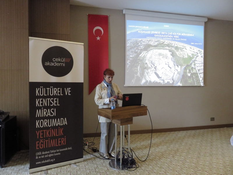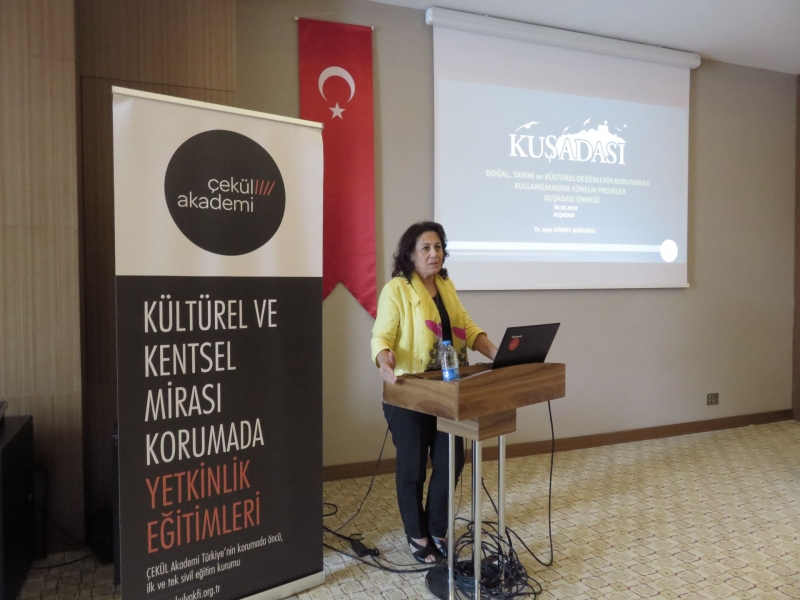 Kuşadası Belediye Başkan Danışmanı ve ÇEKÜL Kuşadası temsilcisi Dr. Ayşe Şerifoğlu ise “Doğal, Tarihi ve Kültürel Değerlerin Korunarak Kullanılmasına Yönelik Projeler; Kuşadası Örneği” başlıklı bir sunum yaptı. Kuşadası Belediyesinin Güney Ege Kalkınma Avrupa Birliği, Yatırım Destek Ofisi ve üniversiteler ile, aralarında ÇEKÜL, TÜRÇEV ve ÇEVKO’nun da bulunduğu sivil toplum örgütleri; yanı sıra özel sektörle yürütülen projeler hakkında bilgi verdi. Güney Ege Kalkınma Ajansı iştiraki ve ÇEKÜL Vakfı destekli “Tarihi Kuşadası Limanı ve Kültürel Rotalar Projesi” ile 7 adet tarihi ve kültürel rota oluşturulduğuna dikkat çeken Şerifoğlu, bu projeyle tarihi Kuşadası evlerinin turizme kazandırılması, yöresel ürünlerin, tarihi ve kültürel değerlerin turizme entegre edilmesinin sağlandığını; Kuşadası genelinde çeşitli kültürel rotaların oluşturulması ve turizmin sürdürülebilirliğinin hedeflendiğini anlattı. Şerifoğlu, bu kapsamda, Kuşadası Belediyesi Ege Mutfakları Evi, Kuşadası Belediyesi Türk Kahvesi Evi, Sevil-Yaşar Altaş Eğitim ve Kültür Merkezi olarak eski eserlerin restore edildiği ve işlevlendirildiğini söyledi.