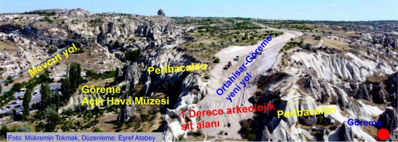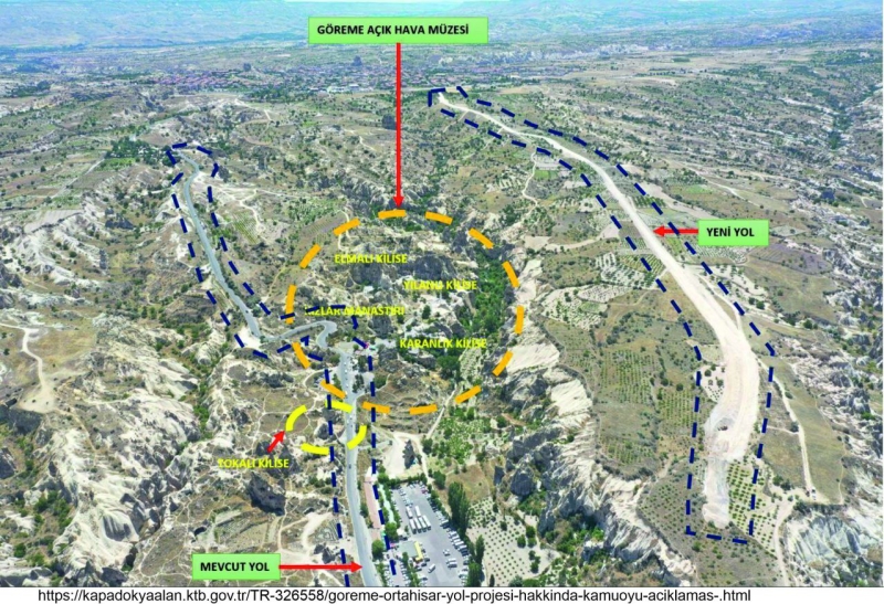 1. Derece Arkeolojik ve Doğal Sit Alanında yeni yol yapımıyla ilgili basında yer alan haberler üzerine, Kapadokya Alan Başkanlığının 10.08.2022 tarihinde kamuoyuna yaptığı açıklamada; “Göreme Beldesini Ortahisar Beldesine bağlayan mevcut 2,8 kilometrelik yol; peribacaları, kaya oluşumları, tescilli kültür varlıkları ve kiliselerin önünden geçmektedir. Söz konusu yolu her gün yüzlerce ağır tonajlı araç yoğun bir şekilde kullanmakta ve arazi morfolojisi gereği kültür varlıklarına zarar vermektedir. Turizm sezonlarındaki yoğun araç kullanımları da göz önünde bulundurulduğunda, söz konusu yolun yakınındaki Tokalı Kilise, Kızlar Manastırı, Elmalı Kilise, Yılanlı Kilise ve Karanlık Kilisenin titreşim ve atmosferik gazlar sebebiyle zarar gördüğü bilinmektedir. Mevcut yolun sürdürülebilir olmadığı, doğal ve kültürel varlıkları olumsuz etkileyerek zarar verdiği ortaya çıkmış ve alternatif bir yol çalışması gerekliliği doğmuştur. Alternatif yol çalışmaları 2,2 kilometre uzunluğunda olup genişliği 5-7 metre arasında değişen kadastral yol hattındadır. Planlanan yol, kaya oluşumlarının uzağından geçmektedir ve Saklı Kiliseye 18 metre mesafededir. Güzergâh çalışmalarından sonra arkeolojik jeoradar çalışmaları yapılmış herhangi bir taşınmaz kültür ve tabiat varlığına rastlanmadığı tespit edilmiştir…’’ denilmektedir.