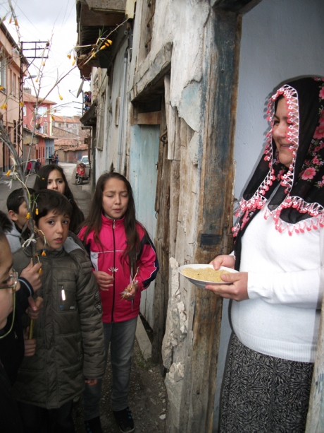 Merasim yapacağız ya! İşi çocukça ciddiye alır, en büyüğümüzün yaptığı görev dağılımıyla gırgır şamata yola düşerdik. En öne elinde çiğdemle süslü çalıyı bayrak gibi taşıyan geçer; arkasında da sırasıyla, bir orkestra şefi gibi çiğdem manisini yöneten, ziyaret edilen ev ahalisine dağıtılacak çiğdemleri tutan, karşılığında bulgur, yağ, kıyma gibi malzemeleri torbasına dolduran ile ateş yakmak için verilecek odunları taşıyacak olan gelirdi. Ve tabii en arkada da tüm mahallenin sesi gür, karnı aç fıkır fıkır orkestra üyeleri. Mahallenin demir tokmaklı bütün kapıları tek tek çalınır, kapı açılıp da ev ahalisi yüzünü gösterene kadar hep bir ağızdan: